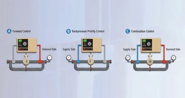O IntelliFlow também pode priorizar e proteger processos ou zonas críticas no sistema de ar. Muitos sistemas têm processos críticos de pressão, que podem parar de funcionar ou criar desperdício se a pressão cair abaixo de um nível mínimo. O controle de contrapressão do IntelliFlow (B) garante a priorização de pressão adequada para evitar esse problema.
