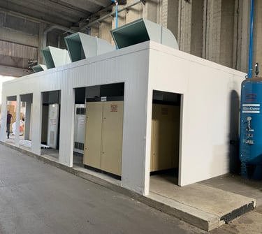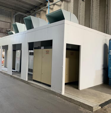Cabine modular industrial que substitui a alvenaria, elimina obras civis e entrega controle térmico, acústico e operacional para sistemas de ar comprimido.