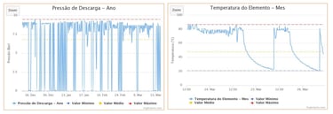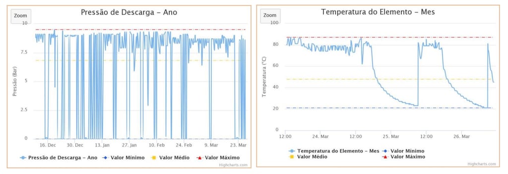 Monitoramento de gráfico identificando o comportamento da máquina em tempo real, sendo possível acompanhar o suprimento de ar comprimido. Tais como, perfil em carga e alívio ou até mesmo a temperatura da unidade que pode apresentar diagnósticos de falhas. Com aumento da sua exponencial, apresentando algum problema.